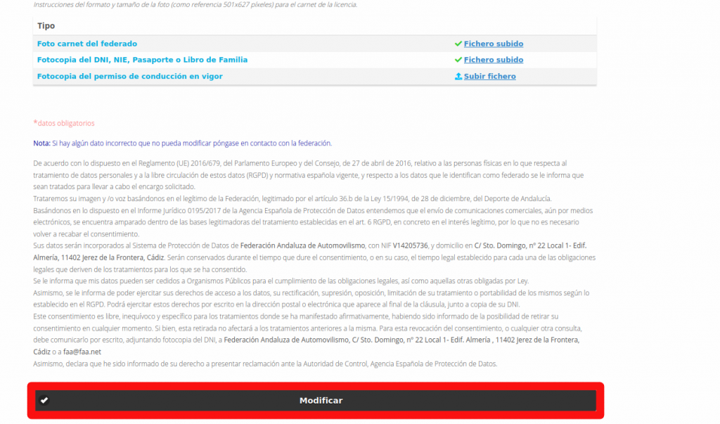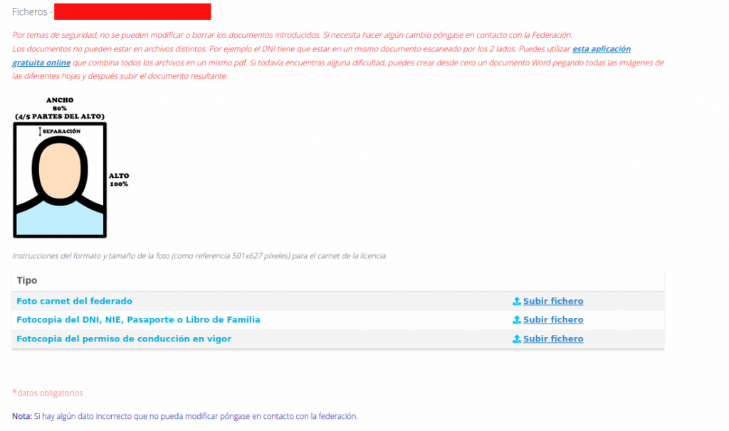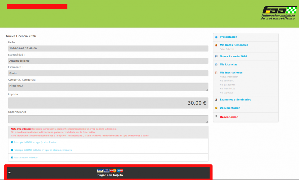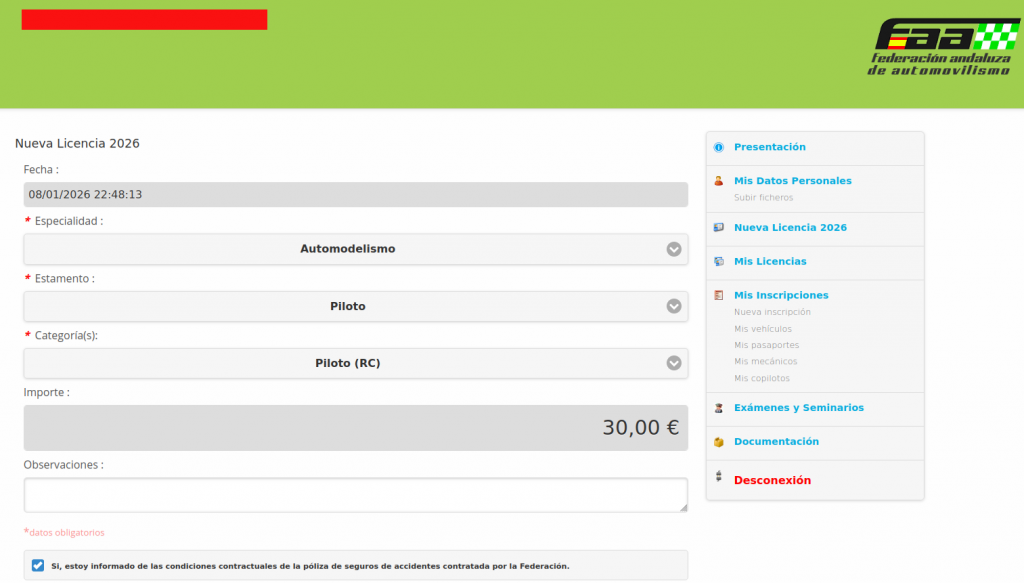 ℹ️ Nota: Al ser una licencia de Radiocontrol (RC), el campo «Carnet de Conducir» NO es necesario. Puedes dejarlo vacío.